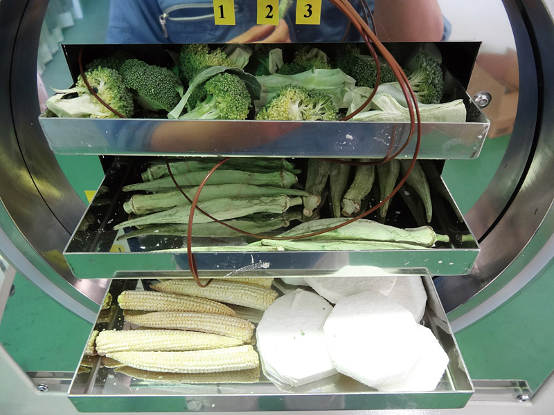 水分を含んだ原料を、マイナス40℃程度で急速凍結し真空状態で水を昇華させて乾燥させるフリーズドライ装置です。栄養価や風味の変化が少ない、多孔質のため水や湯で短時間で戻せるといったメリットがあります。
